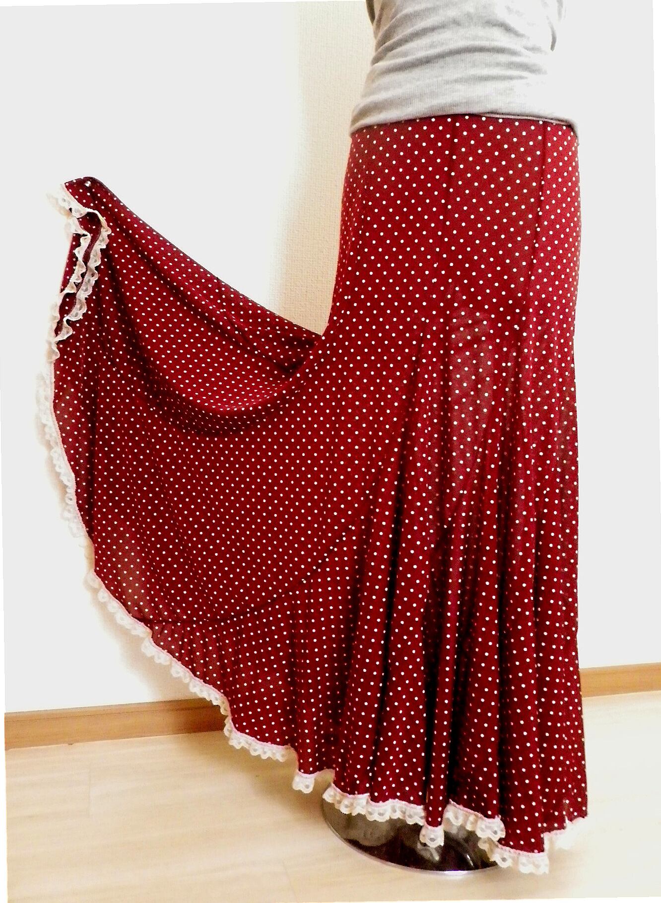 ワインレッドにベージュのシックな水玉に同じベージュのレースをつけて、